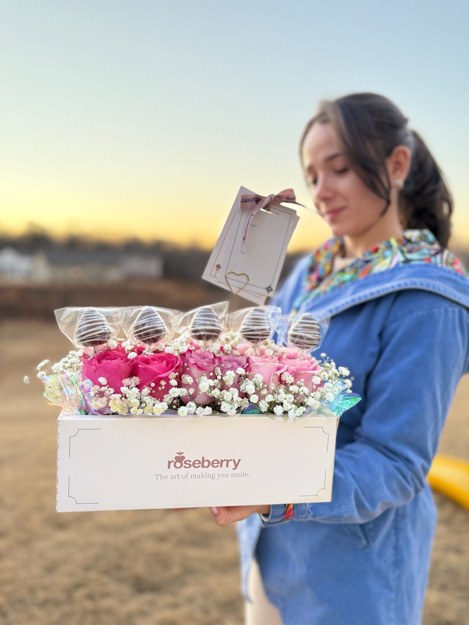 A stylish rectangular box adorned with a dozen roses, elegantly arranged to captivate the eye. Topped with five strawberry-shaped cake filled with strawberry jam and arequipe, adding a sweet touch to this exquisite gift.
