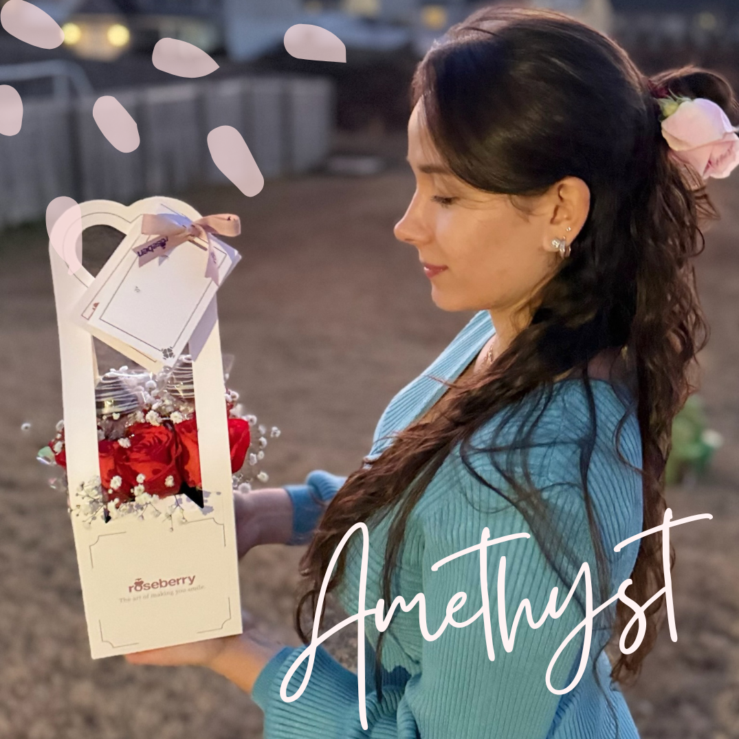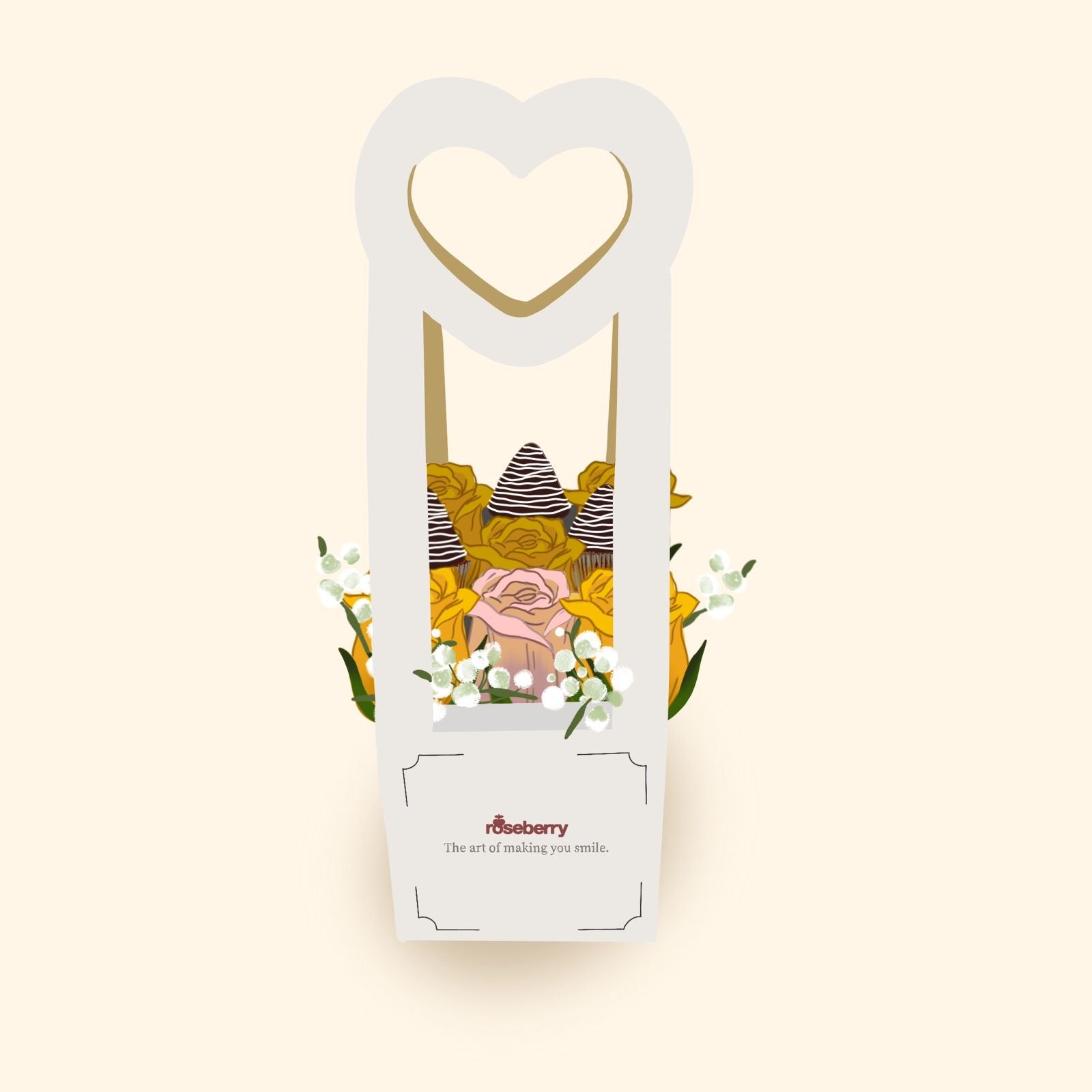 Nine beautiful roses artfully arranged in a square box with a heart-shaped handle, accompanied by four strawberry-shaped cake filled with strawberry jam and arequipe for a perfect blend of romance and sweetness