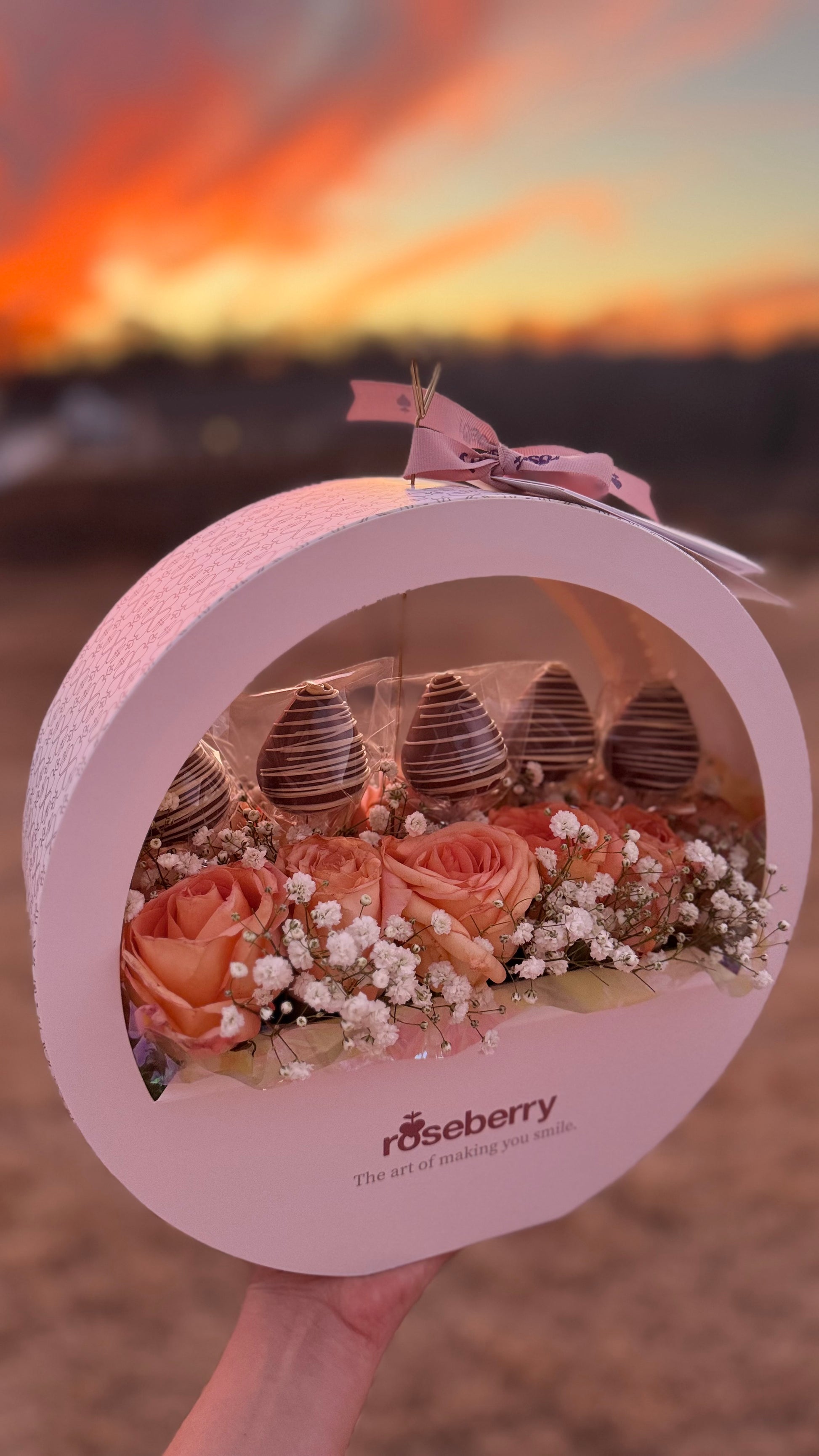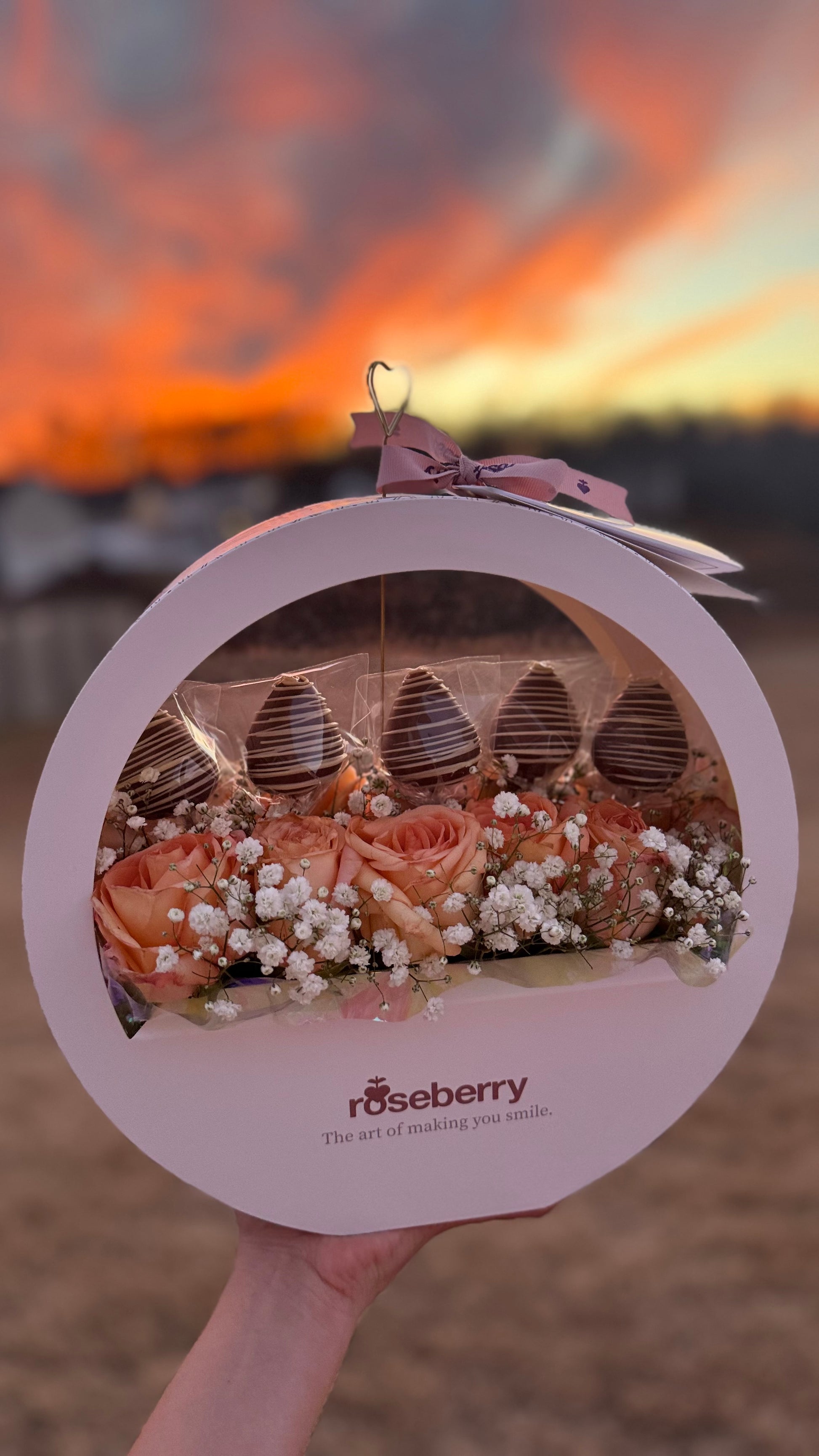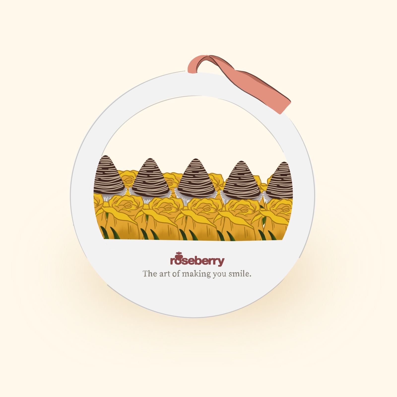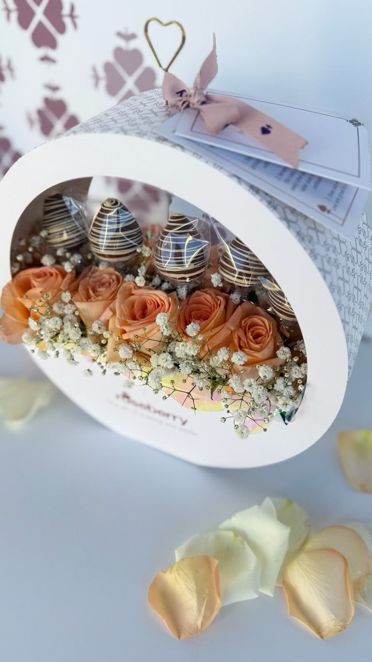 Twelve assorted roses encased in a modern circular box, complemented by five delectable strawberry-shaped cake filled with strawberry jam and arequipe, offering a delightful mix of contemporary elegance and sweet indulgence.