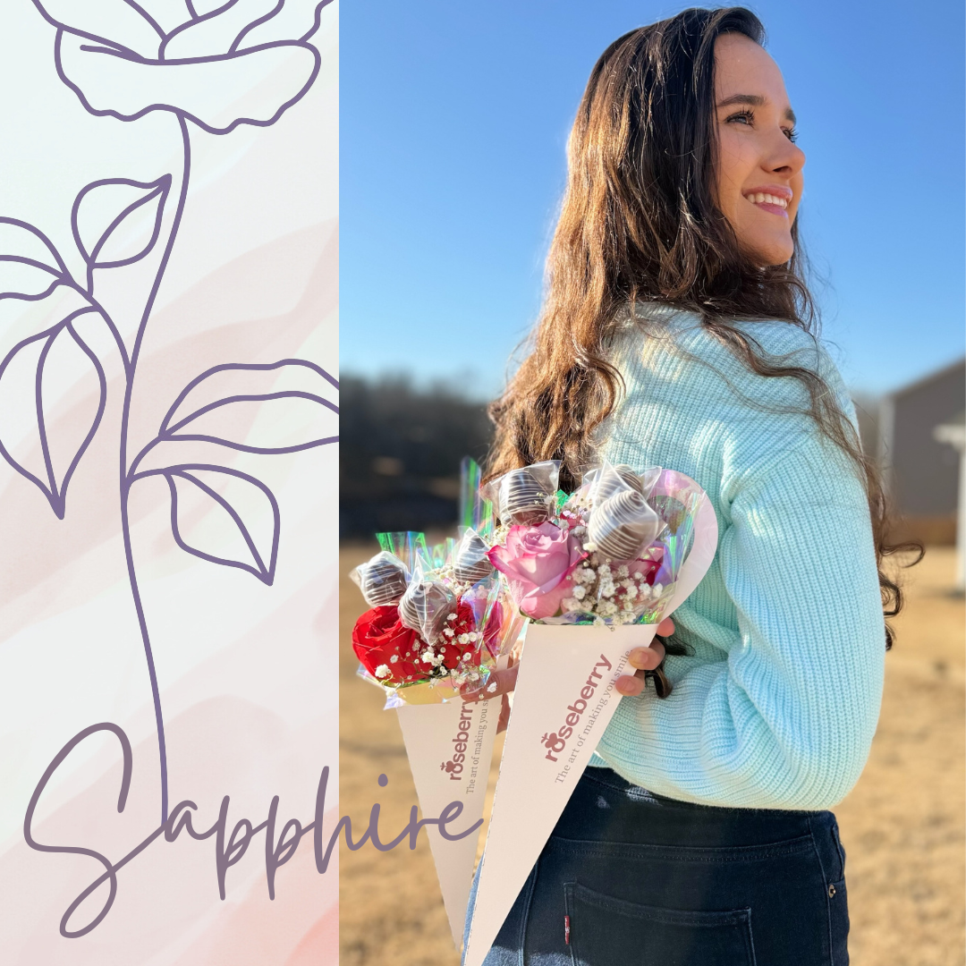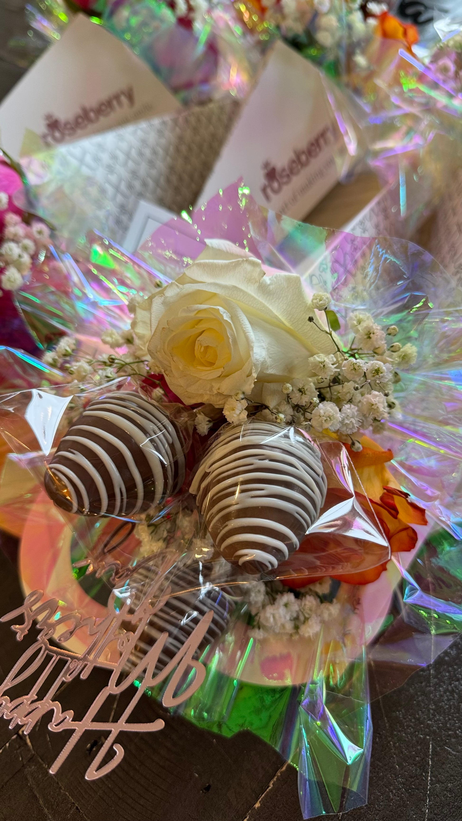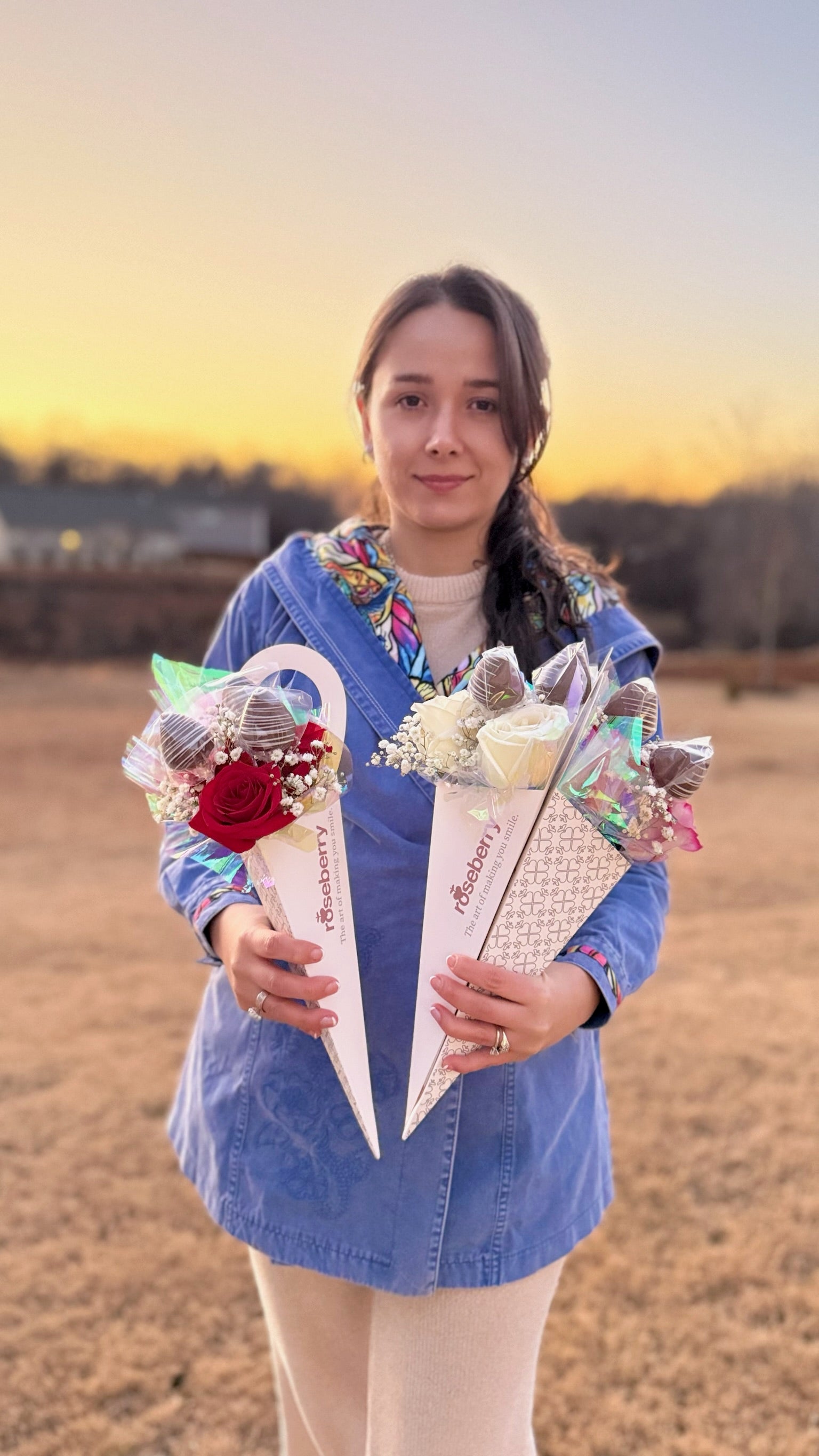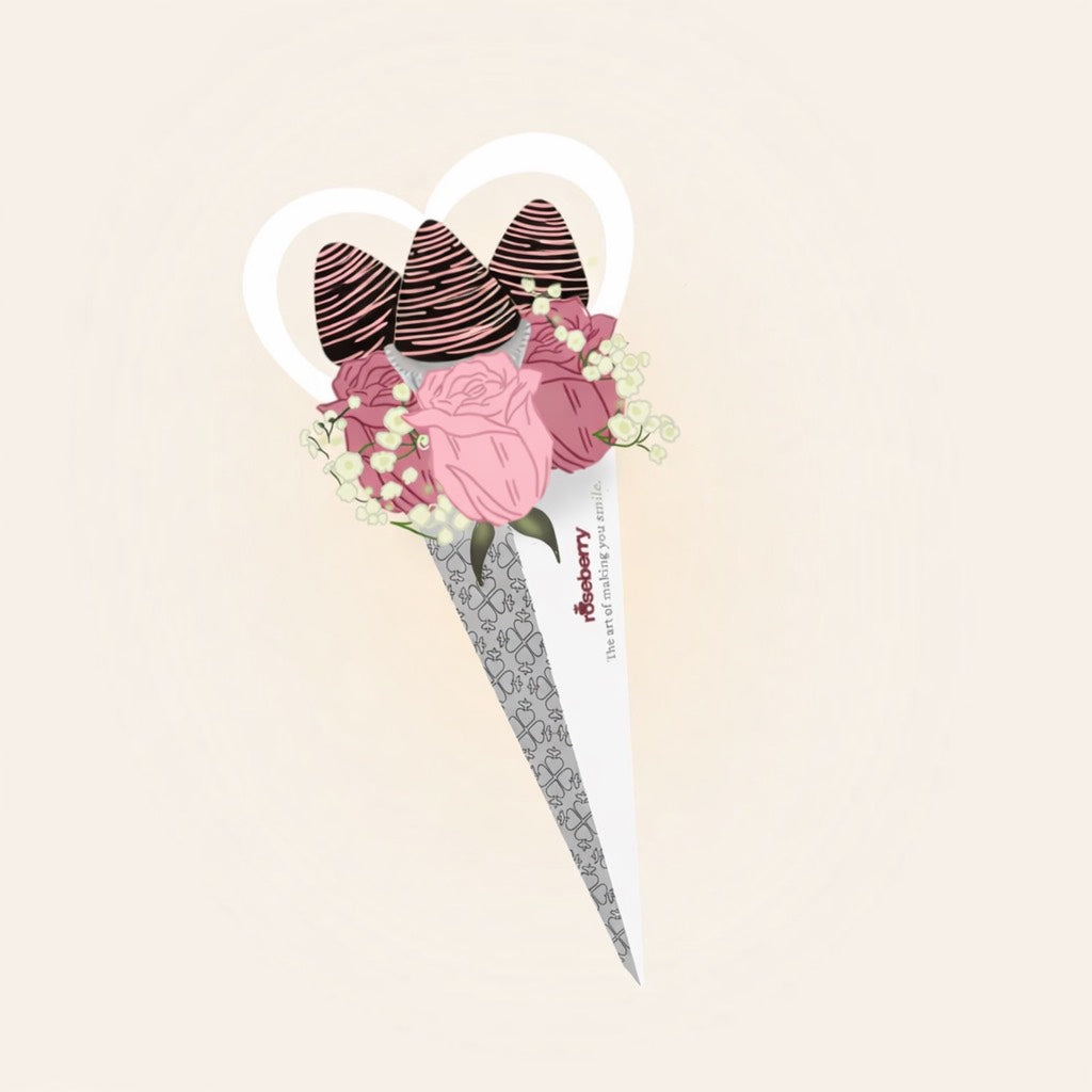 A trio of roses artfully arranged with a sweet surprise: Three strawberry-shaped cake filled with strawberry jam and arequipe for a touch of indulgence and romance.