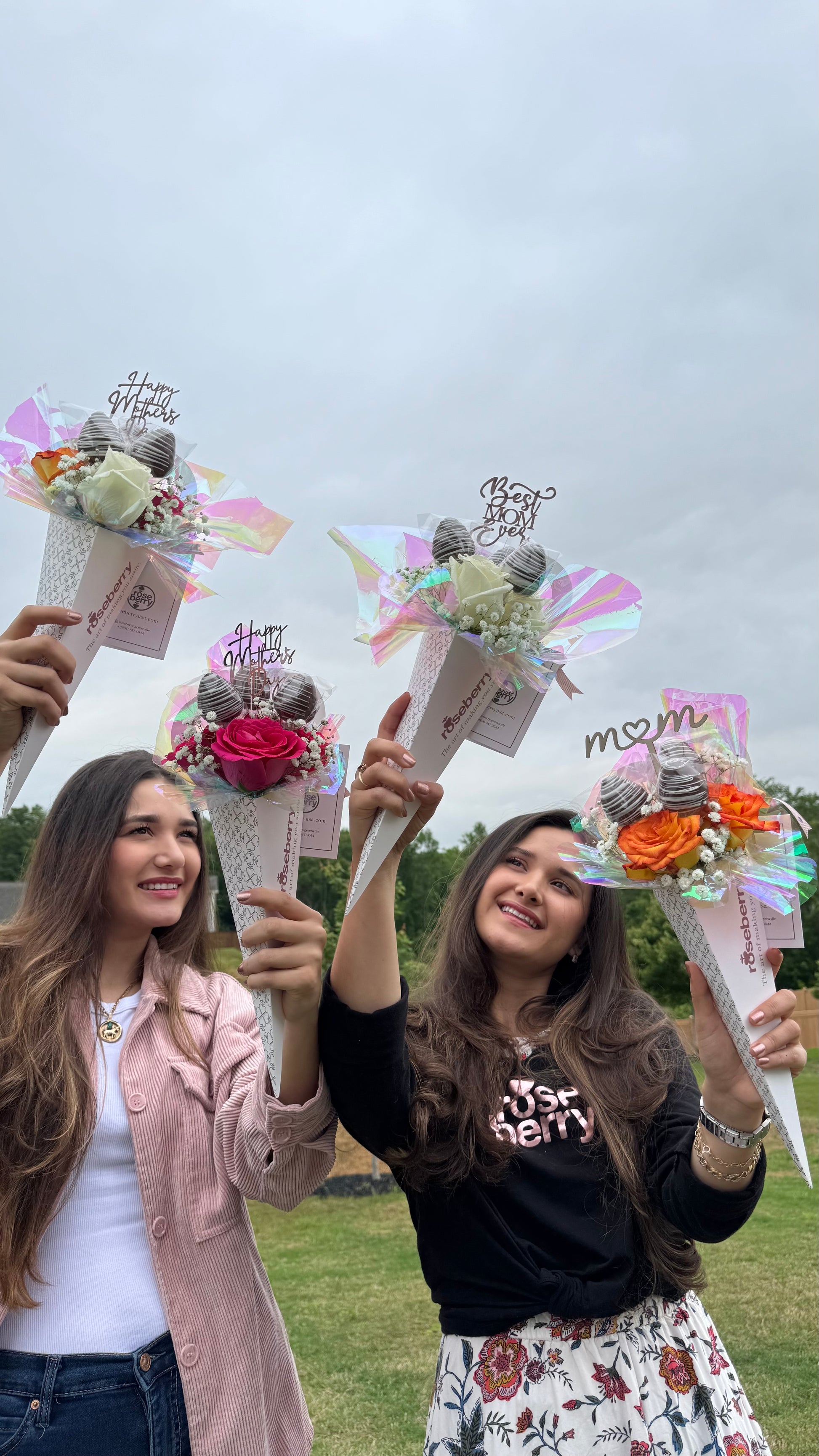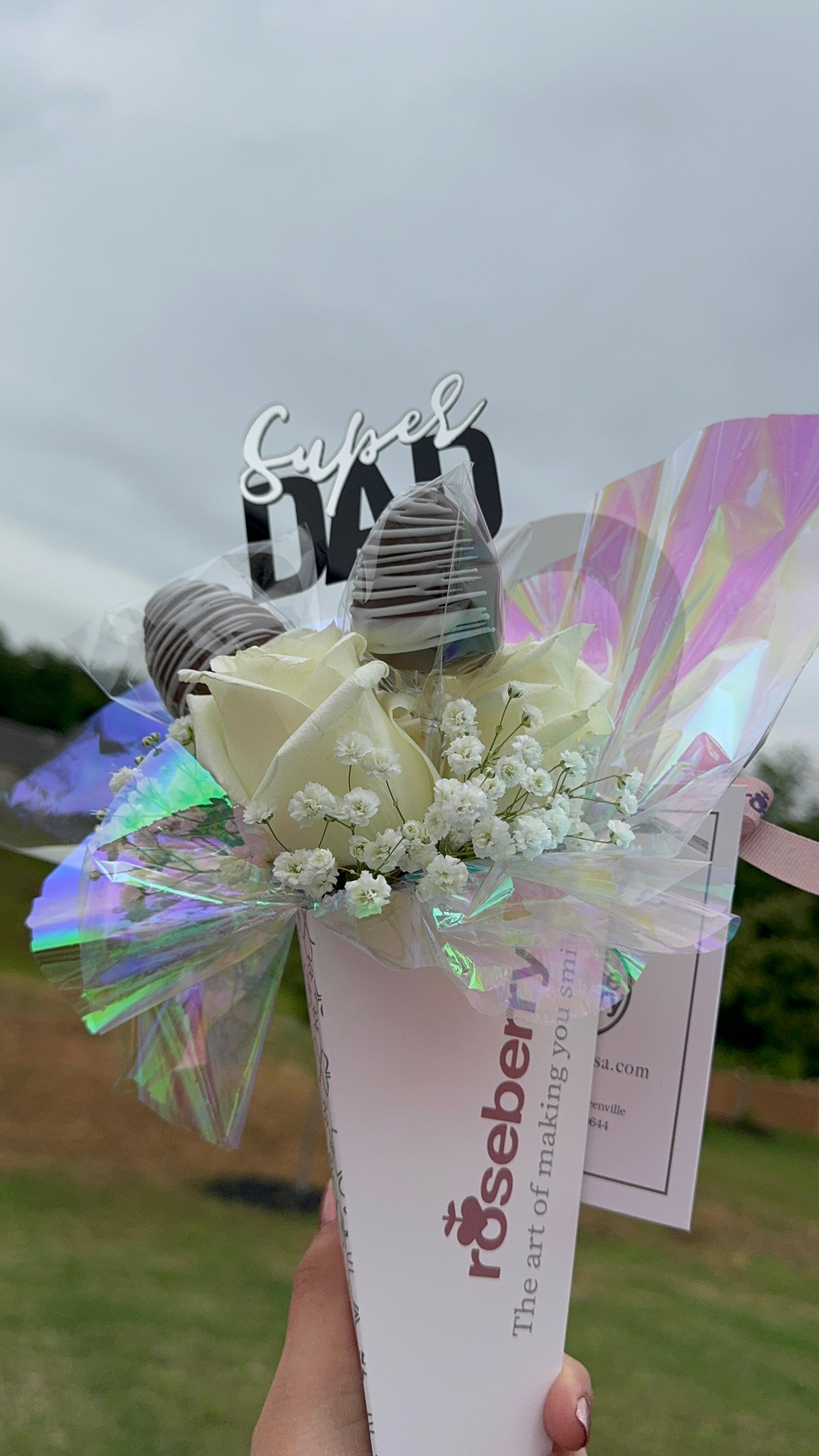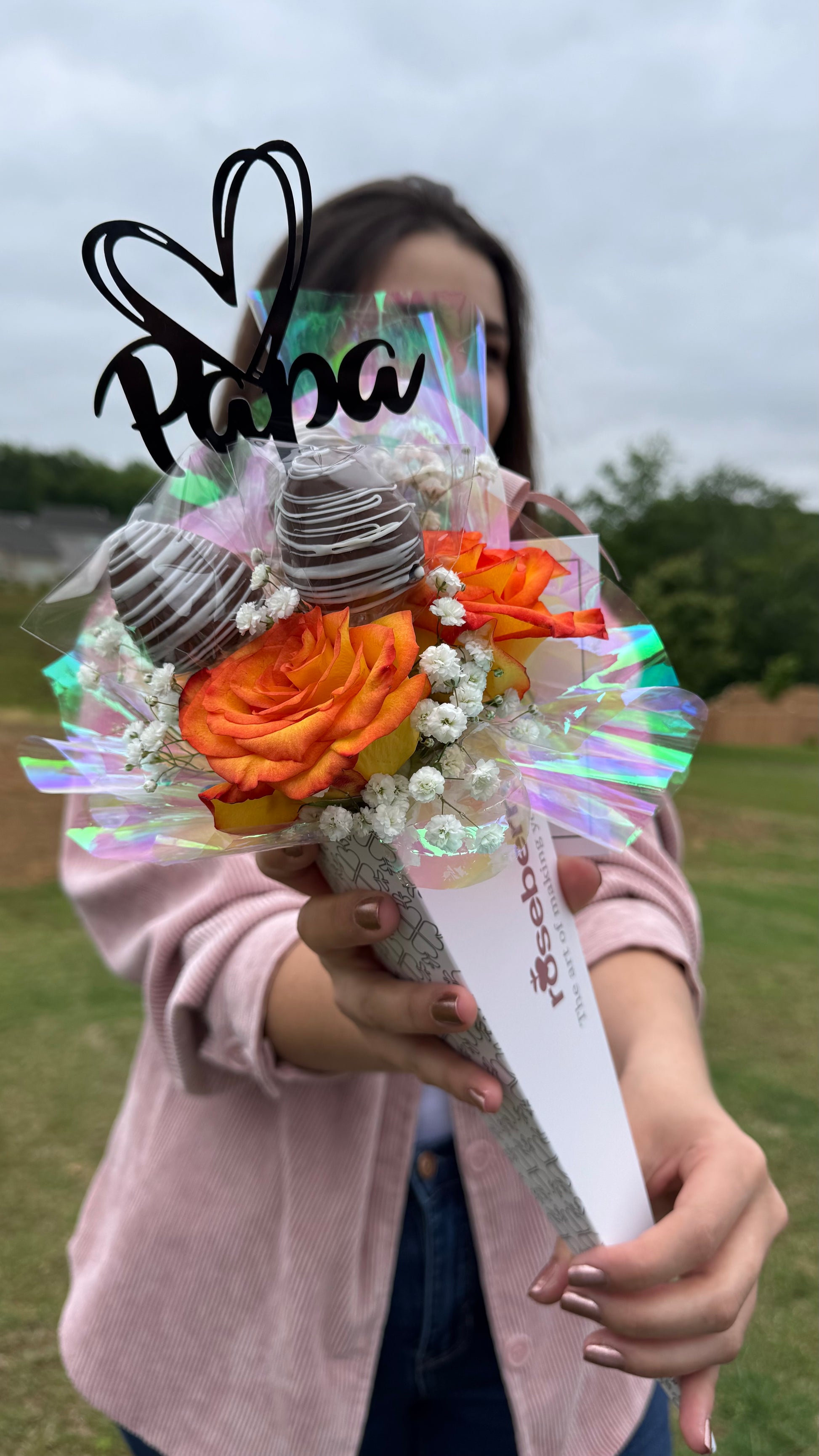 A trio of roses artfully arranged with a sweet surprise: Three strawberry-shaped cake filled with strawberry jam and arequipe for a touch of indulgence and romance.